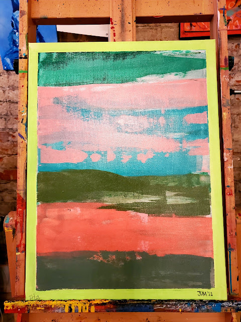 Not a good photo but it captures the gist. On canvas paper (18x24) with a base of acrylic pouring paint then overlaid with acrylic and ink and then scrapped to reveal staining . Has no title, yet. It'll tell me it's name, in time.