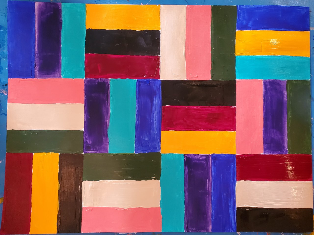 36"x36" acrylic- when I had shown Lulu the draft for this, she advised me that it's called a Log Cabin pattern in both weaving and quilting. The idea had been rattling in my head for a while- for me, it's taking some of the dynamics that Stanley Whitney does so well and for lack of better term, flip flopping them but in a cohesive form where the different colors can engage the viewer or throw them off balance. Push Pull.