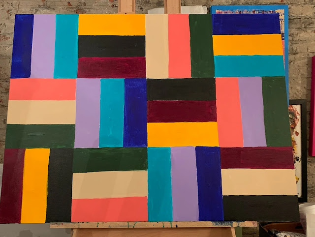 Newest work below, "A Day At The Beach" (which painting this was not-tongue firmly planted in aged cheek). 36"x48" with acrylic base coat and Speedball ink impasto topcoat. Needs some very minor tweaks and then a gloss medium on top. The shine is reflected light. Zoom in for some delicious textures.